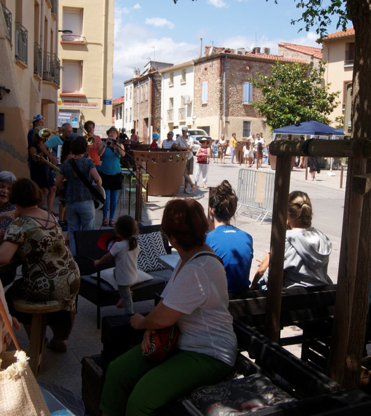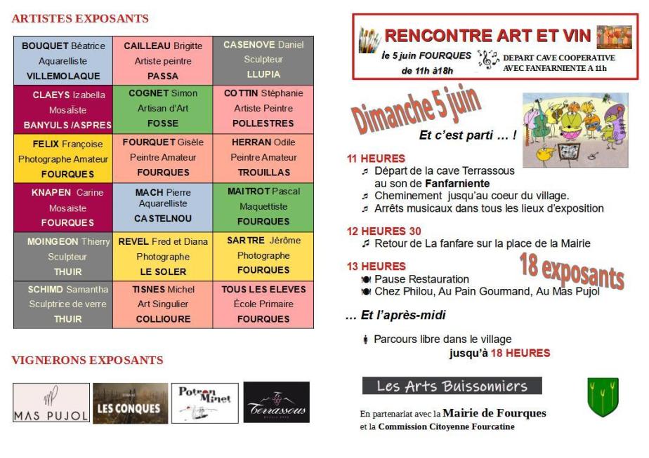 Dès 7h une véritable équipe soudée de bénévoles a dressé les tonnelles sous lesquelles les artistes se sont installés quelques deux heures plus tard. Fanfarniente a assuré le réveil des visiteurs dès 11h et jusqu'à plus de midi en terminant sur la place de la mairie. Si la cave coopérative a été un peu désertée, le coeur du village s'est alors animé de joyeuses conversations autour des tables de Corinne et Philou. Chacun des artistes a eu ses admirateurs intéressés, curieux, et a pu nouer un contact chaleureux avec son public.