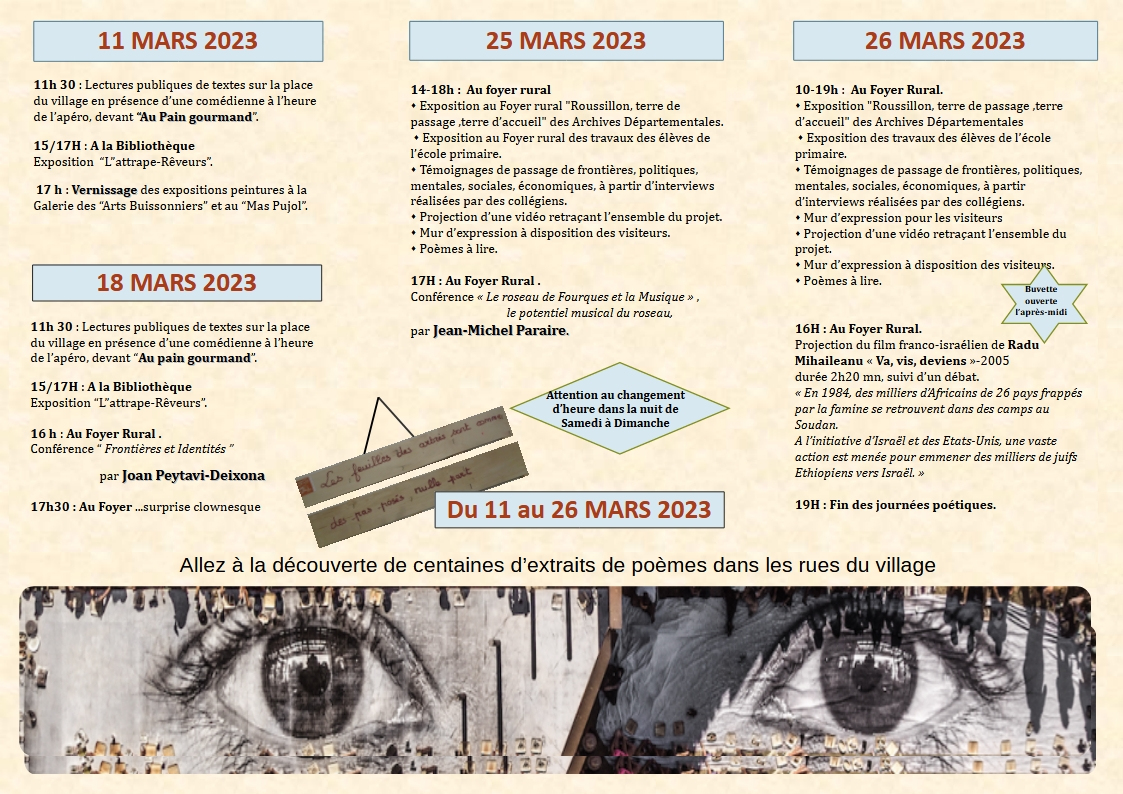 L'association se propose d'organiser des éclosions poétiques dans le village du 11 au 27 mars 2023 en association avec la Bibliothèque, les écoles, la commune et sous l'égide du Printemps des Poètes.