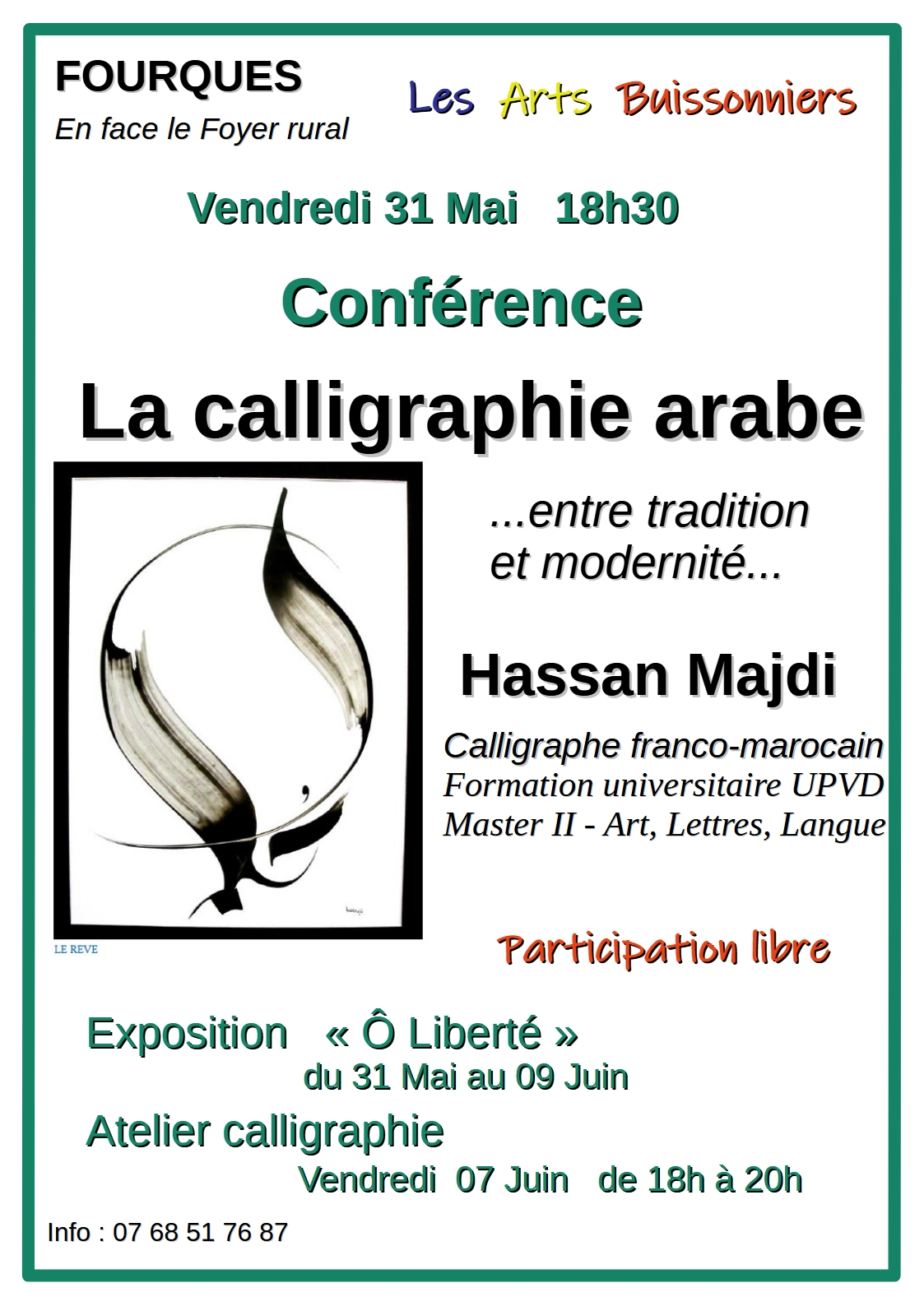 Hassan Majdi donnera une conférence le 31 mai au Foyer rural de Fourques à 18h30. A l’issue de la conférence se tiendra le vernissage de son exposition « Ô liberté » visible aux Arts Buissonniers jusqu’au 7 juin. Enfin Hassan Majdi animera un atelier de calligraphie arabe le vendredi 7 juin de 18h à 20h sur le lieu de son exposition.