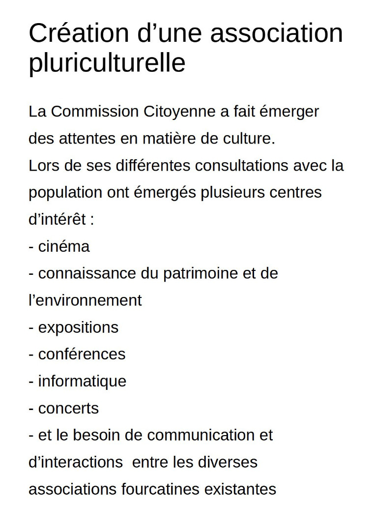 Le Forum est l'occasion pour les Arts Buissonniers de présenter le bilan de l'action à Fourques en 2022 mais aussi de proposer, dans la suite logique des discussions engagées par la Comission citoyenne avec la population, un calendrier pour la création d'une association pluriculturelle.