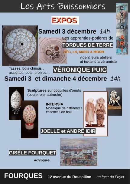 L"association "Tordues de terre" exposera samedi de 14h à 18h les productions de ses adhérentes ainsi que celles de Véronique PUIG, céramiste bien connue dans le département qui est aussi leur professeur.